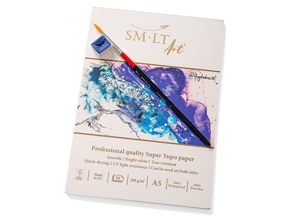 Smlt Art Pro range Yupo paper has an extra-smooth, tear-resistant synthetic surface and a hard-back cover. Perfect for alcohol ink artwork, permanent markers, and other creative techniques. Yupo paper sheets are glued on one side, completely bleedproof, waterproof, and non-absorbent. Can be used on both sides, offering a durable and versatile surface.