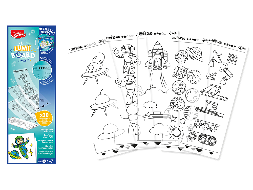 Papildomi švieslentės „Maped Creativ Lumi Board“ lapai. Suteikite įvairovės ir pailginkite linksmybes – tiesiog įstumkite naują lapą, ant viršaus uždėkite popieriaus lapą ir pradėkite piešti. Puikus būdas pasireikšti kūrybiškumui! Tinka visoms švieslentės „Lumi Board“ versijomis. Rinkinyje yra 30 lapų su smagiais paveikslėliais.
