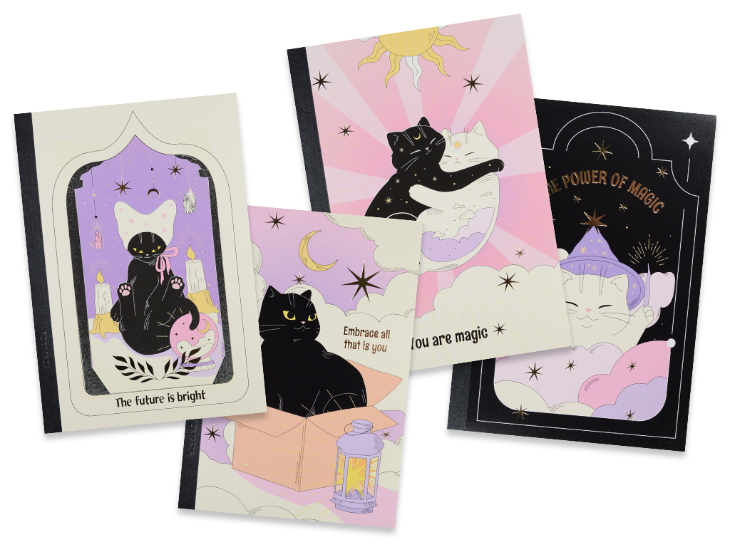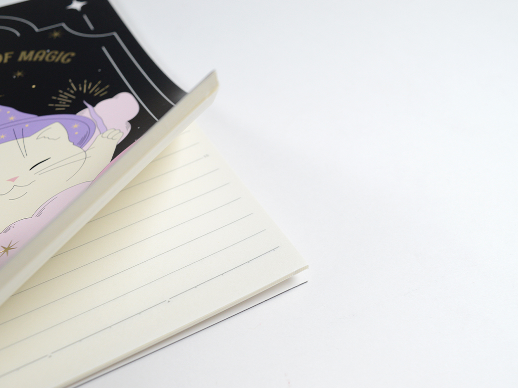 Iš lygaus, liniuoto popieriaus pagamintas storas sąsiuvinis „M&G Magic“ tinka kasdieniniams užrašams. Minkštas viršelis papuoštas žavingais piešiniais su auksiniais akcentais, o klijuotas apvadas užtikrina, kad jis būtų lengvas ir patogus nešiotis.