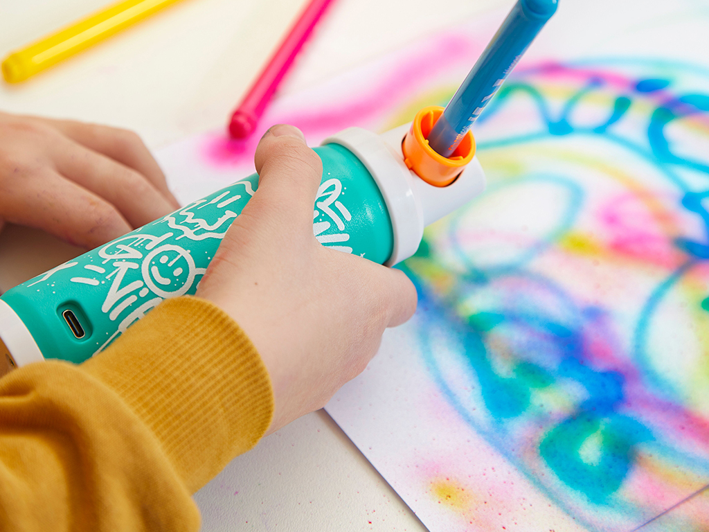 Vienkārši ievietojiet komplektā iekļauto flomāsteru elektroniskajā aerogrāfa izsmidzinātājā un nospiediet pogu. Vērojiet, kā krāsas parādās uz papīra, lai nekavējoties varētu baudīt radīšanas prieku. Aerogrāfs ir uzlādējams, izmantojot USB-C, tāpēc priekam un jautrībai nav laika robežu.