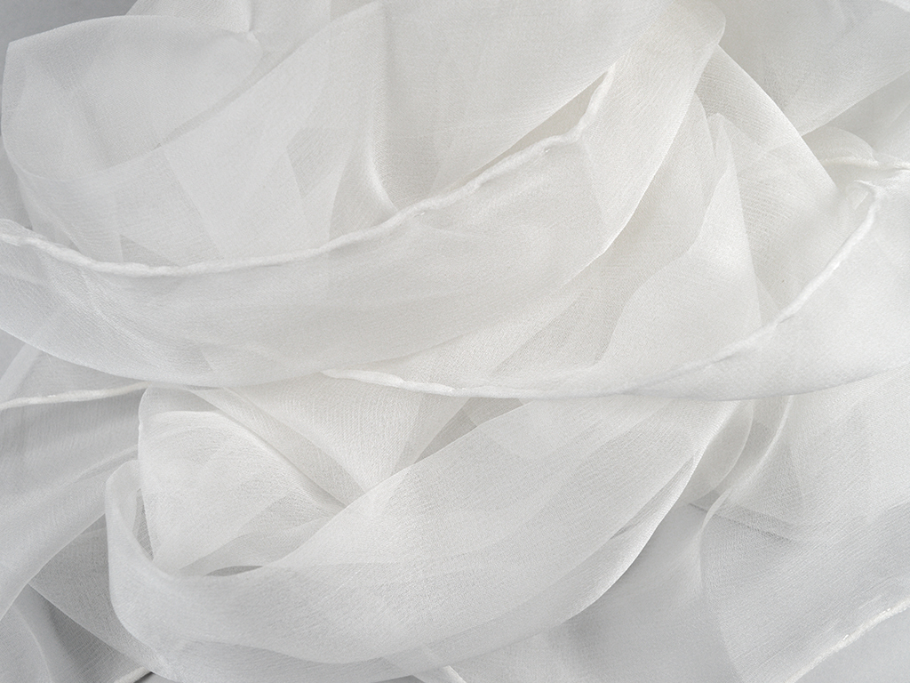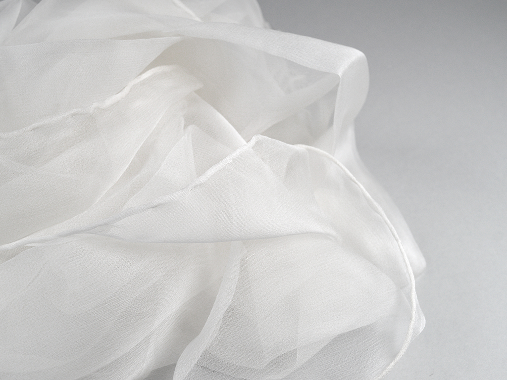 Chiffon 3.5 ir viegls un gaisīgs zīds, ideāli piemērots plūstošu šaļļu, lakatu un smalku aksesuāru izgatavošanai. Tā smalkā pinuma zīda struktūra padara audumu trauslu, caurspīdīgu, ar nelielu tekstūru, piešķirot tam raksturīgo matēto spīdumu. Auduma svars ir aptuveni 15-20g/m2, padarot to par vienu no smalkākajiem zīda veidiem.