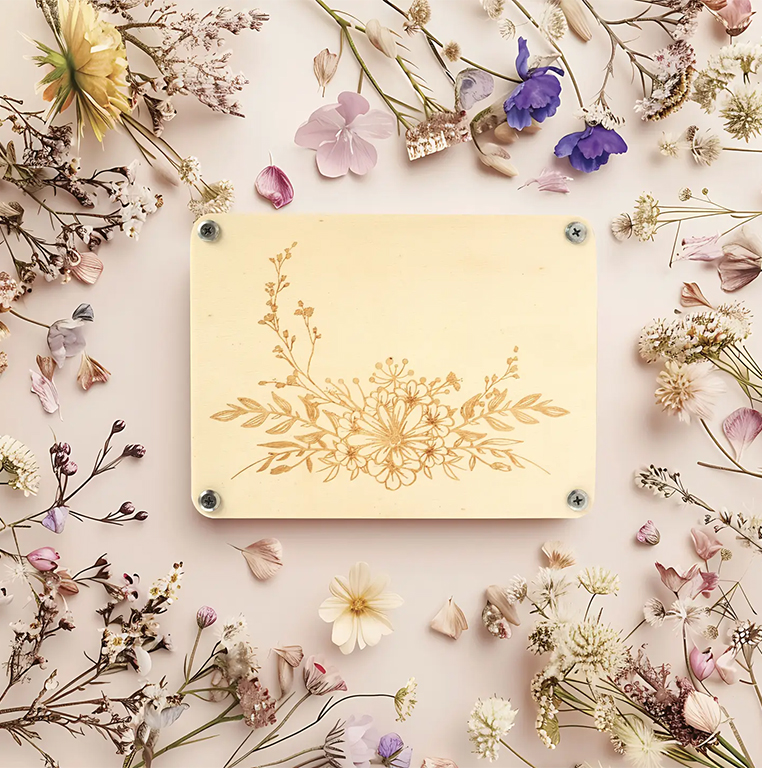 – koka ziedu spiede ar skaistu gravējumu priekšpusē