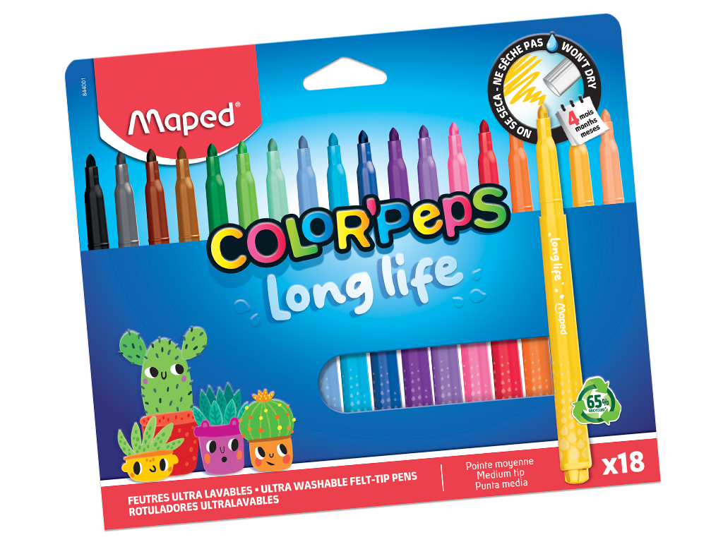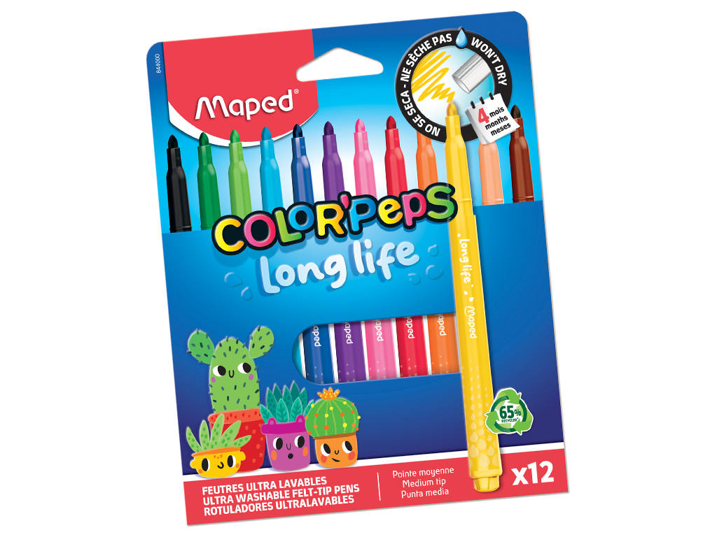 Viltpliiats, mis ei kuiva ilma korgita isegi kuni 4 kuu jooksul! Maped Long Life 2 viltpliiatsid on erksate värvidega ja kestavad tõeliselt kaua. Enamus tekstiilidelt ja nahalt lihtsasti mahapestav. Fikseeritud koonilise otsaga (d=3,6mm). Plastikust osad sisaldavad vähemalt 65% taaskasutatud materjale.
